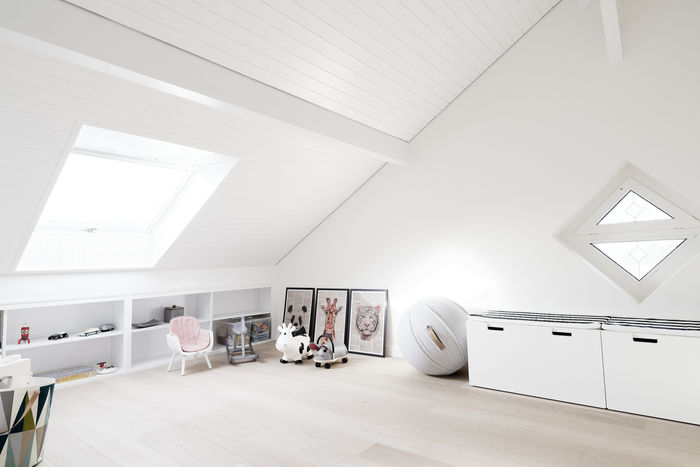 La salle de jeux en attique est un refuge clair et lumineux. Tout a été pensé pour répondre aux besoins du client et utiliser au mieux la lumière.